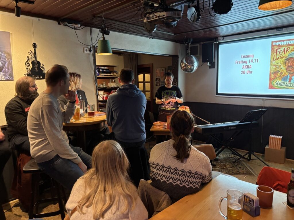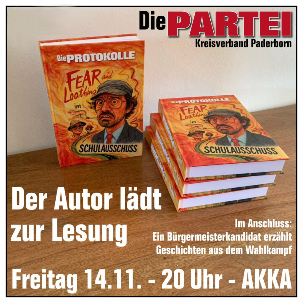 Am 14.11.2025 stellte der Autor bei einer Lesung in der AKKA sein Buch „Die PROTOKOLLE – Fear and Loathing im Schulausschuss“ vor. Darin erzählt er die komplette Geschichte hinter den Protokollen: vom naiven Einstieg in die Kommunalpolitik über den medialen Aufschrei bis hin zum Umgang von Politik und Presse mit Satire, Öffentlichkeit und Meinungsfreiheit – subjektiv, überzeichnet, persönlich und bewusst jenseits von Neutralität.